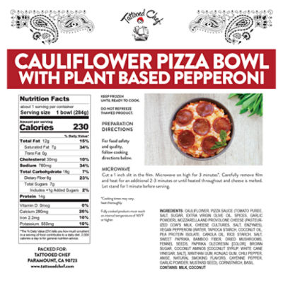 Tattooed Chef Tattooed Chef - Cauliflower Pizza Bowl. Track macros calories and more with MyFitnessPal. 1 3 pizza 113g Nutrition Facts.